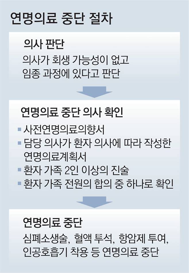 현행 연명의료결정법에 따르면 회생 가능성이 없고 사망에 임박한 상태라고 의사 2명이 판단한 경우 ‘임종 과정에 들어갔다’고 판단하고 연명의료 중단 의사를 확인하게 된다.