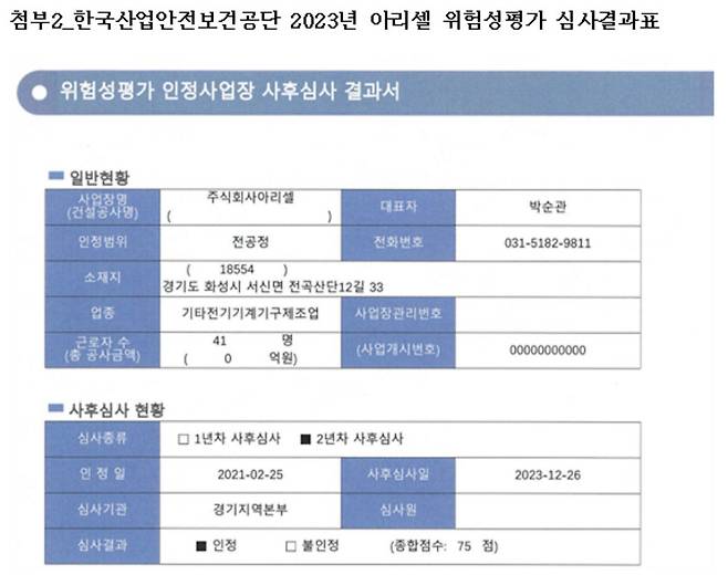 인정사업장 제도는 100인 미만 사업장이 위험성평가를 실시하면 산업안전보건공단이 심사해 인정(70점 이상)하고, 산재보험료 할인(50인 미만)등 혜택을 준다. 교육과 컨설팅 후 실시한 위험성평가에 대해 심사하고 인정이 이뤄지면, 이후 2년간 매년 사업장이 자체로 실시한 위험성평가에 대해 사후심사를 하는데, 아리셀은 2021년에는 81점, 22년에는 88점, 23년에는 75점을 받아 모두 심사를 통과했다.