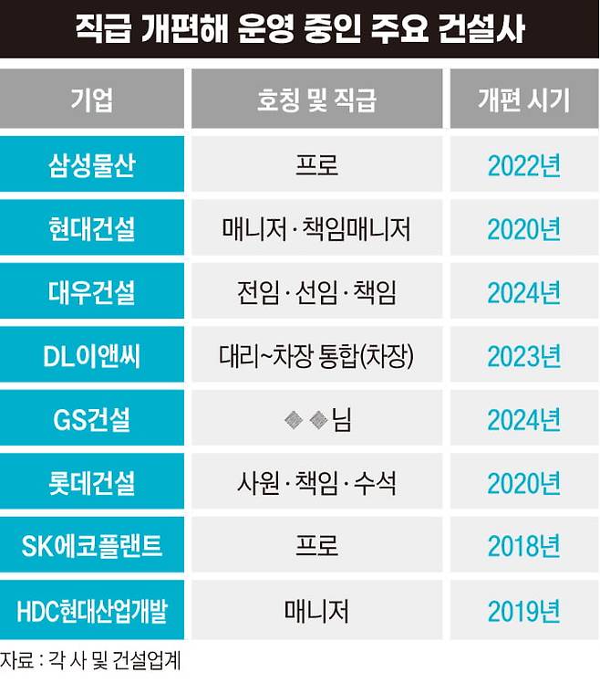 이 같은 변화가 어제오늘 일은 아니다. 2018년 SK에코플랜트(옛 SK건설)가 부장 이하 직급을 ‘프로’로 통일한 뒤 경쟁사들 역시 직급 개편을 단행했다. HDC현대산업개발, 롯데건설, 현대건설, 삼성물산 건설부문도 차례로 변화의 주인공이 됐다.
