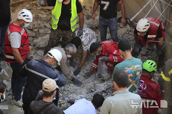 [와르다니예=AP/뉴시스] 9일(현지시각) 레바논 와르다니예에서 대피소로 사용되던 호텔이 이스라엘군의 공습을 받은 후 구조대가 희생자를 찾기 위해 잔해를 파헤치고 있다. 2024.10.10.