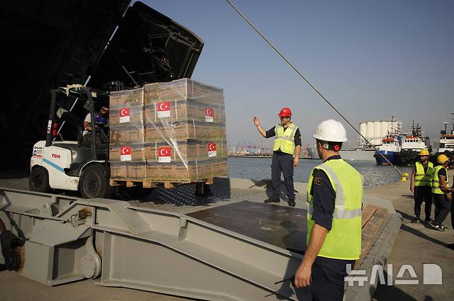 [베이루트=AP/뉴시스] 9일(현지시각) 레바논 베이루트 항구에서 근로자들이 튀르키예가 보낸 인도주의적 지원 물품을 군함에서 하역하고 있다. 2024.10.10.