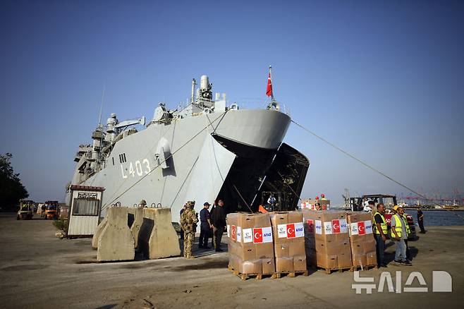 [베이루트=AP/뉴시스] 9일(현지시각) 레바논 베이루트 항구에서 근로자들이 튀르키예가 보낸 인도주의적 지원 물품을 군함에서 하역하고 있다. 2024.10.10.