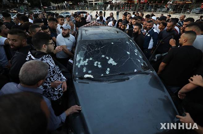 [나블루스=신화/뉴시스] 9일(현지시각) 요르단강 서안지구 나블루스에서 이스라엘군의 총격으로 사망한 팔레스타인인들이 탑승했던 차량 주위에 사람들이 몰려 있다. 팔레스타인 보건부는 사복 차림의 이스라엘군 특수부대원들이 최소 4명의 팔레스타인인을 살해했다고 발표했다. 이스라엘군은 나블루스에서 수배 중이던 5명을 사살했으며 이중엔 알아크사 순교자 대대 지휘관도 있었다고 밝혔다. 2024.10.10.