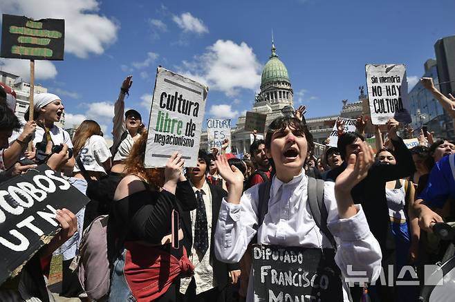 [부에노스아이레스=AP/뉴시스] 9일(현지시각) 아르헨티나 부에노스아이레스의 국회의사당 밖에서 교수와 대학생들이 하비에르 밀레이 대통령의 공립대학 예산 증액 법안 거부에 항의하며 시위하고 있다. 아르헨티나는 공립대학 학비가 무료로 야당은 물가 상승을 이유로 재정 지원 증액 법안을 통과시켰으나 밀레이 대통령은 이를 거부했다. 2024.10.10.