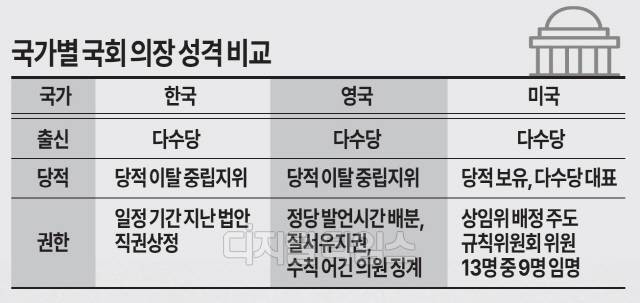 22대 국회도 마찬가지다. 국민의힘은 지난 6월 11일 사퇴 촉구 결의안을 발의했고, 같은 달 18일엔 상임위 강제 배정 등에 대한 무효를 확인하기 위해 우 의장을 피청구인으로 하는 권한쟁의 심판을 청구했다. 단지 법적으로 의장의 당적 보유를 금지한다고 해서 국회 의장직이 '중립적인 중재자'로 인식되는 것은 아닌 셈이다.