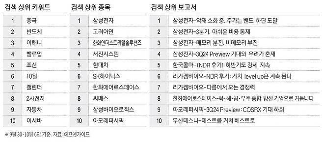 한 주간 투자자들의 이목이 쏠렸던 종목은 삼성전자, 고려아연, 한화인더스트리얼솔루션즈, 서진시스템, 현대차 등으로 나타났다. 키워드 검색 순위에서는 최근 경기 부양에 나서며 글로벌 증시에 영향을 미치고 있는 중국이 1위에 올랐고, 2위가 반도체, 3위는 유진투자증권의 이해니 연구원이 올랐다. 보고서 순위 1위부터 4위까지는 최근 5만원 선을 오르내리는 삼성전자에 대한 보고서가 차지했다.