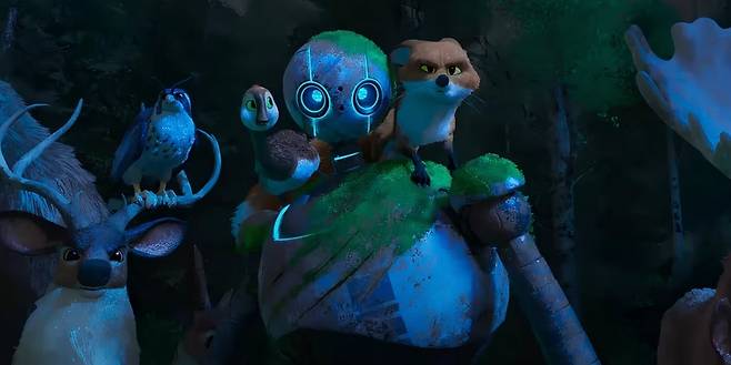 로즈는 인류 문명의 부산물을 대표하고, 숲속 동물들은 그를 경계하는 자연을 대표한다. <와일드 로봇>이 그 특유의 감성으로 해내는 또다른 놀라운 일은, 바로 환경에 관련된 이야기를 하면서도 인류 전체를 '악'으로 규정하지 않는다는 것이다. 영화 초반의 동물들은 로즈 없이도 충분히 잘 살 수 있었겠지만, 영화 후반의 동물들은 로즈의 기여와 도움으로 인해 처음보다도 더 끈끈한 하나의 공동체가 되어 있다.