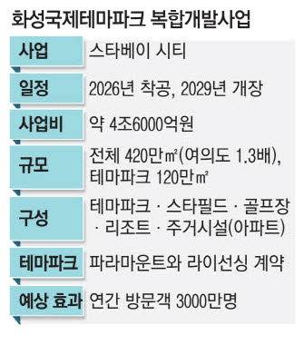 화성국제테마파크는 숙박·쇼핑·여가·엔터테인먼트·미디어 시설이 집약된 복합개발 프로젝트다. 화성시 남양읍 일대 약 420만㎡(127만평) 용지에 조성된다. 사업명은 '스타베이 시티'로, 여의도의 1.3배 규모 용지에 약 4조6000억원을 투자해 혁신적인 미래형 관광단지를 만드는 게 목표다.