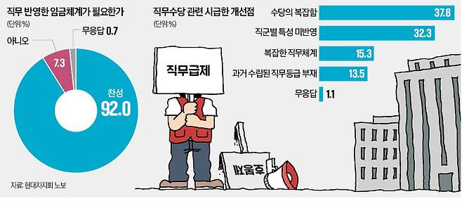 노조 관계자는 “이번 설문을 바탕으로 내년 노사 협상(임단협)에서 임금체계 개편이 핵심 아젠다로 급부상할 가능성이 있다”며 “국내 노사관계에 가장 큰 영향을 끼치는 현대차가 직무급제 도입에 성공하면 노사관계 판이 뒤집힐 수 있다”고 말했다. 현대차 소속 조합원은 총 4만3000명으로 금속노조 조합원(18만6000명)의 23%에 달한다.