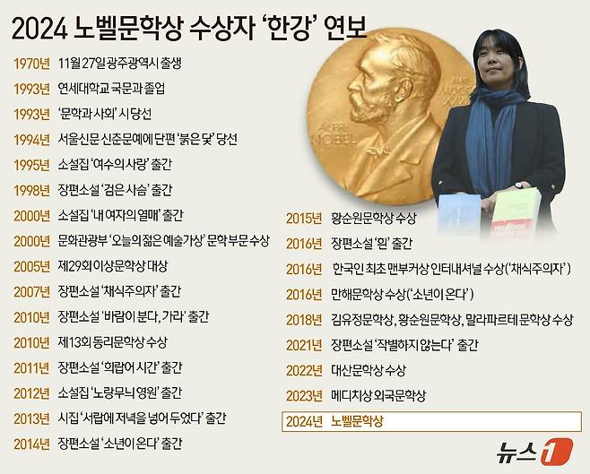 (서울=뉴스1) 윤주희 디자이너 = 한국을 대표하는 소설가 한강(54)이 2024년 노벨문학상을 받는 쾌거를 이뤘다. 한국인이 노벨상을 받은 것은 2000년 김대중 대통령에 이은 두 번째다. 한국 문학계의 경사라는 분위기 속에서 외신들도 한강 작가의 노벨상 수상 소식을 긴급 타전했다.