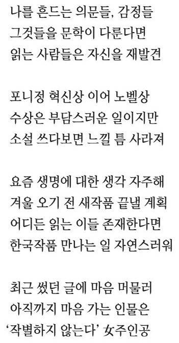 ―애써 희망하시는 일도 아니고, 또 답변하시기도 꺼려지시겠지만 엄연히 다가올 미래라고 생각하여 조심스럽게 질문 드립니다. 저는 10년 안에 '소설가 한강'의 이름이 스웨덴에서 호명되리라고 확신하고 있습니다(10일 노벨 문학상 수상). 이미 유럽은 한강의 이름을 연거푸 외치고 있고요. 한 나라의 문학이 언어의 장벽을 넘어 다른 나라에서 읽히고 너른 공감을 얻는 것은 작가와 독자, 즉 인류에게 어떤 의미를 형성한다고 보십니까.
