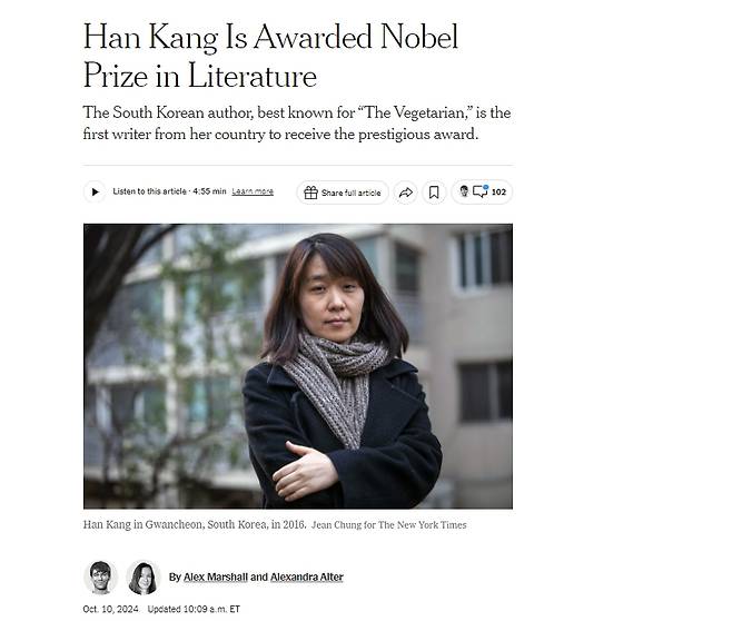 NYT는 한강의 수상이 노벨 문학상의 지평을 넓히는 데도 기여했다고 평가했다.