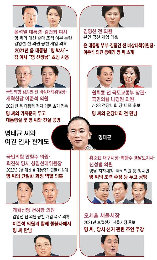 명 씨는 김 전 의원의 소개로 2021년 서울시장 보궐선거 후보였던 오세훈 서울시장도 만났다. 명 씨는 한 언론에 “오세훈을 만든 것, 그게 내가 한 것”이라며 “판 짜고 여론조사 들고 다녔다”고 했다. 오 시장은 대변인을 통해 “명 씨는 김 전 의원이 소개했고, 관계 유지를 조언했지만 아시다시피 이어가지 않았다”고 해명했다.