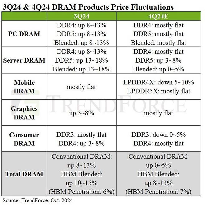 트렌드포스는 "소비자 수요가 약화가 지속되면서 AI 서버가 메모리 수요의 주요 동인으로 부상했다"며 "4분기 메모리 가격 상승세가 둔화될 예정이지만, HBM 점유율 상승에 힘입어 전체 D램 평균 가격은 오를 것"이라고 밝혔다.