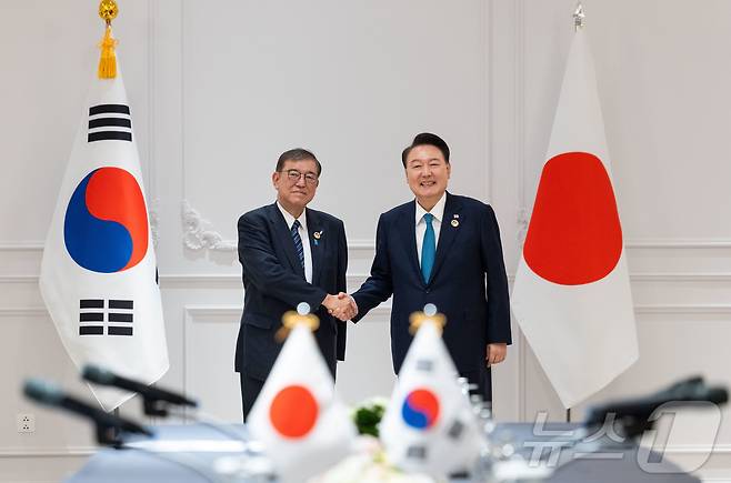 (서울=뉴스1) 송원영 기자 = 윤석열 대통령이 10일(현지시간) 라오스 비엔티안의 한 호텔에서 열린 한일 정상회담에서 이시바 시게루 일본 신임 총리와 악수하며 기념촬영을 하고 있다. (대통령실 제공) 2024.10.11/뉴스1