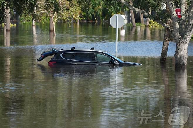 (클리어워터 AFP=뉴스1) 우동명 기자 = 10일(현지시간) 허리케인 밀턴이 상륙한 플로리다주 클리어워터에서 물에 잠긴 차량이 보인다. 2024.10.11