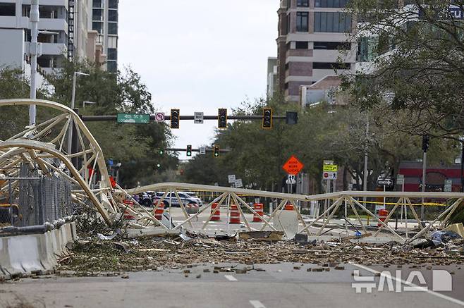 [세인트피터즈버그=AP/뉴시스] 10일(현지시각) 미 플로리다주 세인트피터즈버그의 고층 건물 공사 현장에 있던 대형 크레인이 허리케인 밀턴의 여파로 맞은편 건물에 쓰러져 있다. 2024.10.11.