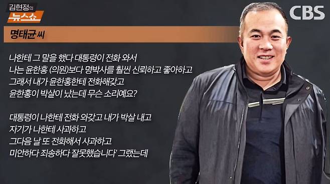 ◇ 김현정> 잠깐만요. 지금 말이 좀 빨랐는데 그러니까 무슨 소리예요? 대통령이 전화를 해서 윤한홍보다 명 박사를 훨씬 신뢰하고 좋아한다, 이렇게 얘기를 했고 윤한홍 의원이 박살났다?