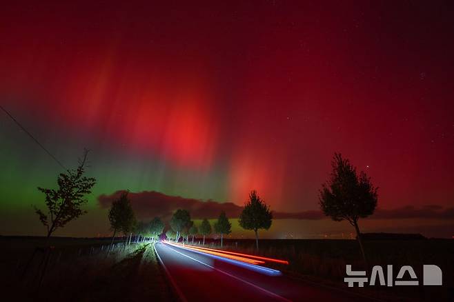 [리에첸=AP/뉴시스] 10일(현지시각) 독일 동부 리에첸의 밤하늘에 오로라(북극광)가 아름답게 빛나고 있다. 2024.10.11.