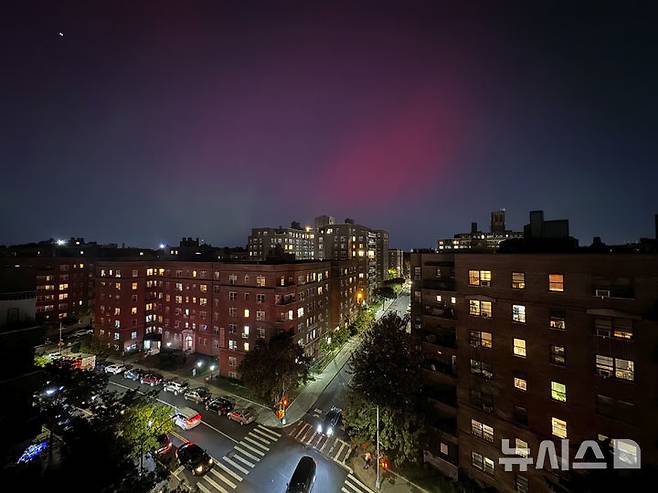 [뉴욕=AP/뉴시스] 10일(현지시각) 미국 뉴욕의 퀸스버러 아파트 건물 상공에 오로라(북극광)가 펼쳐져 있다. 2024.10.11.