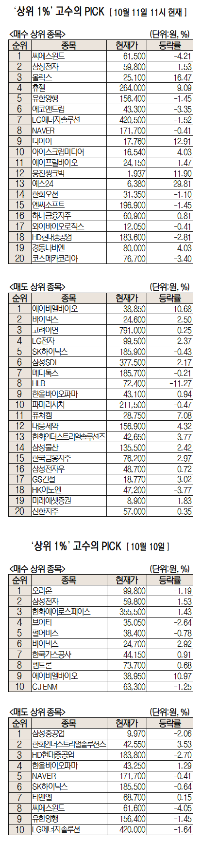 미래에셋증권은 자사 고객 중에서 지난 1개월간 수익률 상위 1% 투자자들의 매매 종목을 집계해 실시간·전일·최근 5일 기준으로 모바일트레이딩시스템(MTS)상에서 공개하고 있다. 이 통계 데이터는 미래에셋증권의 의견과 무관한 단순 정보 안내이며 각각의 투자자 개인에게 맞는 투자 또는 수익 달성을 보장하지 않는다. 또 테마주 관련종목은 이상 급등락 가능성이 있으므로 유의해야 한다.