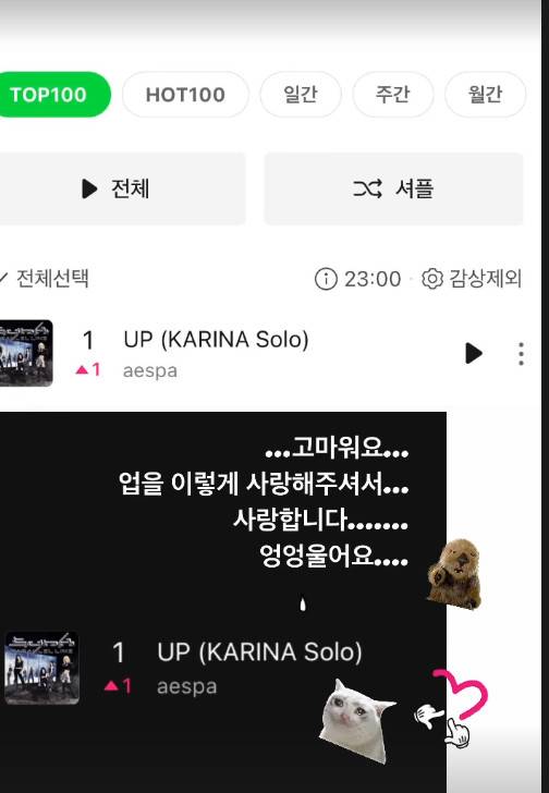 11일 카리나는 자신의 개인 계정을 통해 자신의 솔로곡 'UP'이 벅스 실시간 차트와 멜론 TOP100∙HOT100 1위에 오른 것에 "고마워요 업을 이렇게 사랑해주셔서...사랑합니다 엉엉 울어요"라며 감사한 마음을 드러냈다.