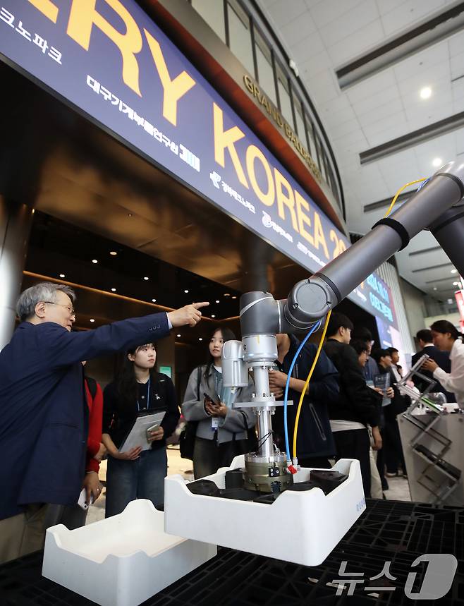 (서울=뉴스1) 오대일 기자 = 11일 서울 강남구 코엑스 그랜드볼룸에서 열린 이차전지 소재·부품·장비·리사이클링 컨퍼런스 '배터리 코리아(BATTERY KOREA) 2024'에서 참관객들이 블럭나인 부스의 리튬이온 배터리 제조 공정을 살펴보고 있다. 2024.10.11/뉴스1