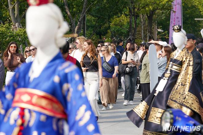 11일 서울 종로구 광화문광장에서 열린 제9회 종로한복축제에서 외국인 관광객들이 이동하고 있다. 이번 축제는 이날부터 12일까지 이틀간 광화문광장과 의정부지 역사유적광장 일대에서 진행된다.