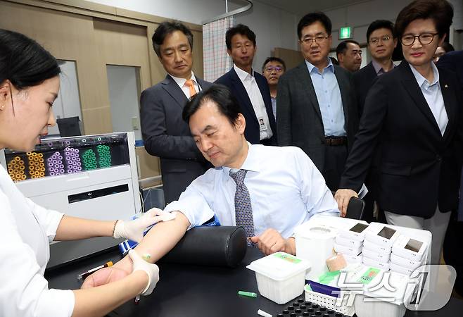 (서울=뉴스1) 김명섭 기자 = 안규백 더불어민주당 국회 국방위원회 위원이 11일 오후 서울 동작구 서울지방병무청 제1병역판정검사장에서 열린 국정감사 병역판정검사 시찰에서 채혈 검사를 하고 있다. 2024.10.11/뉴스1