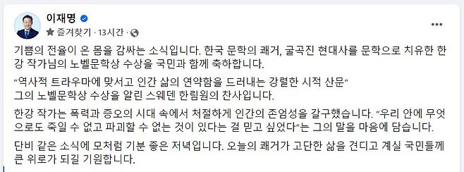 | ▲ 이재명 더불어민주당 대표가 10일 소셜미디어에 올린 한강 작가 노벨 문학상 수상 축하 글. |