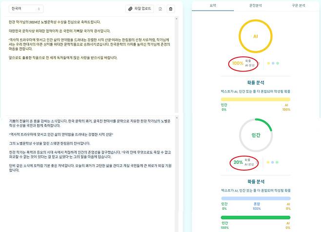 실제 윤 대통령 축전을 AI를 이용해 작성했을 확률이 어느 정도인지 분석해주는 AI 생성 검사기에 돌려봤다. 한국어를 지원하는 뉴럴라이트와 isgen 외에 영문 번역이 필요한 GPT제로 등 3가지 도구를 활용했고, 검사기의 정확성 확인을 위해 이재명 더불어민주당 대표가 전날 소셜미디어에 올린 한강 작가 노벨문학상 수상 축하 글을 비교 대상으로 삼았다.