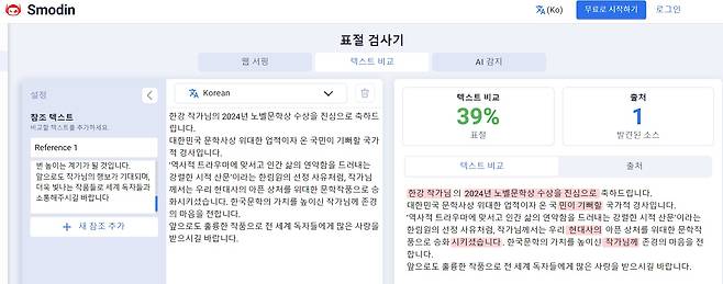 | ▲ 한국어를 지원하는 표절 검사기인 ‘Smodin'에서 윤석열 대통령 한강 작가 노벨문학상 수상 축전과 챗GPT 생성 글을 비교했더니 39% 일치한다는 결과가 나왔다. |
