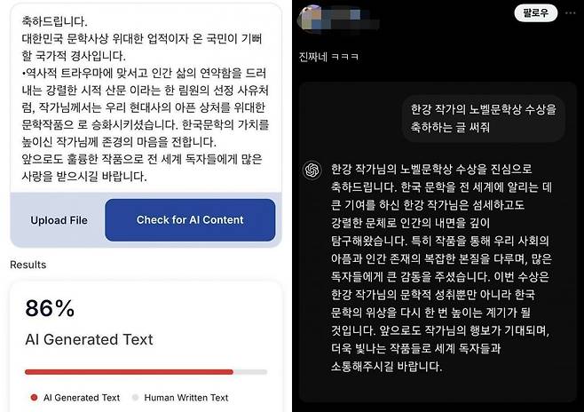 | ▲ 일부 누리꾼이 10일 윤석열 대통령이 소셜미디어에 올린 한강 작가 노벨문학상 수상 축전 내용을 AI 검사기에 돌렸더니 ‘86% AI 생성 글’이라는 결과가 나왔다고 공유했다. |