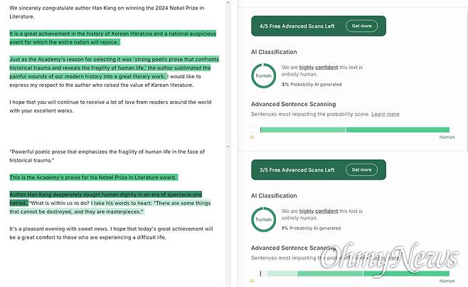 윤 대통령 '한강 노벨상 축전', 챗GPT로 썼다? AI 검사기 돌려보니 [오마이팩트]
