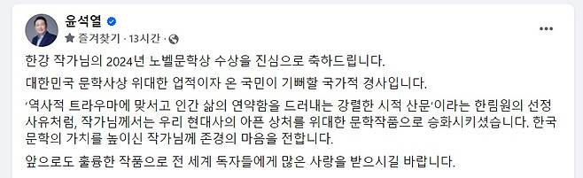 | ▲ 윤석열 대통령이 10일 소셜미디어에 올린 한강 작가 노벨문학상 수상 축전. |