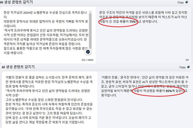 먼저 한국어를 지원하는 뉴럴라이터(https://neuralwriter.com/ko/content-detector-tool/) AI 생성 콘텐츠 감지기는 윤 대통령 축전에 대해 "문장 구조의 약간의 어색함 같은 뉘앙스를 포함해 사려 깊고 진지한 어조로 잘 만들어진 축사처럼 보이기 때문에 이 텍스트가 AI가 아닌 사람이 쓴 것일 확률이 75%라고 생각한다"라는 결과를 내놨다.