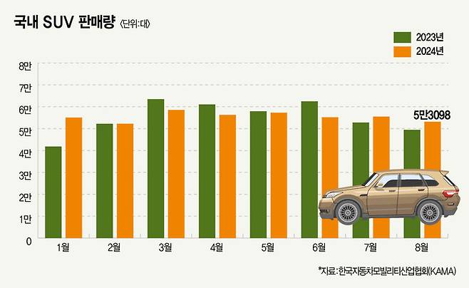 한국자동차모빌리티산업협회(KAMA)에 따르면 올 1~8월 기준 중형·준중형 SUV는 전체 승용차 판매량의 34%를 차지한 것으로 나타났다. 올 들어 판매차량 10대 중 3대가 중형 또는 준중형 SUV인 셈이다. 전체 SUV 판매량 가운데 중형과 준중형 비율은 60%에 달한다. 완성차 업계에서는 내수 시장이 위축되는 가운데 주요 자동차 제조사가 상대적으로 마진이 좋은 SUV 판매에 주력한 점과 소비자 선호도 변화가 맞물린 결과로 본다.