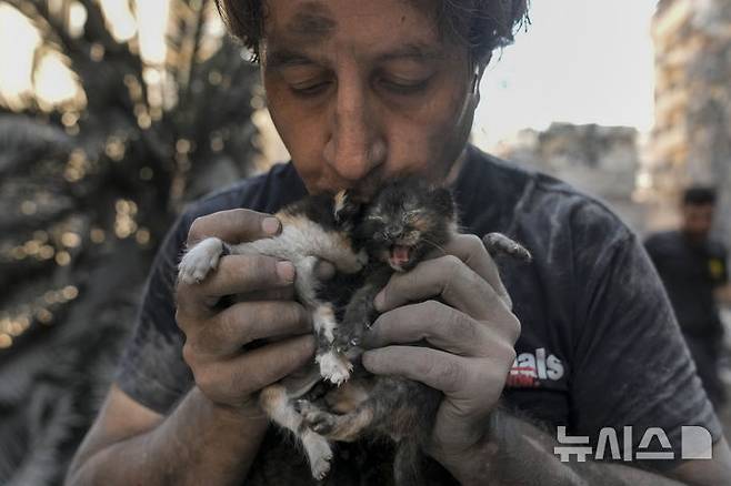 [베이루트=AP/뉴시스] 11일(현지시각) 레바논 베이루트에서 동물 구조단체 자원봉사자가 이스라엘의 공습으로 파괴된 건물 잔해 속에서 새끼 고양이들을 구조해 입 맞추고 있다. 2024.10.12.