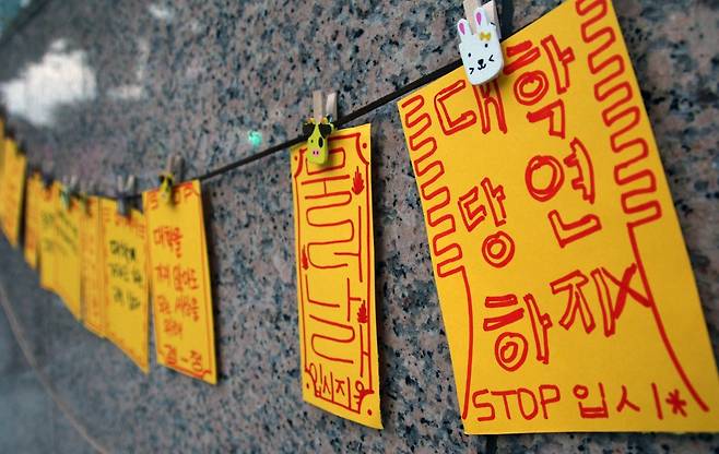| ▲ 2018년 8월 수능 D-100일 '입시 거부' 퍼포먼스에 붙은 '대학 당연하지 X' 표어 |