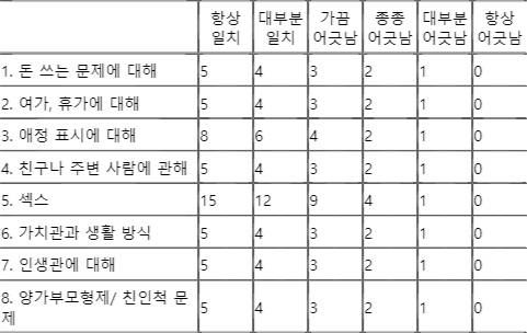 ✏️1. 다음 사항에 대해 당신과 배우자 사이에 얼마나 의견이 일치 또는 어긋나는지 각 문항마다 체크하십시오. (총 점)