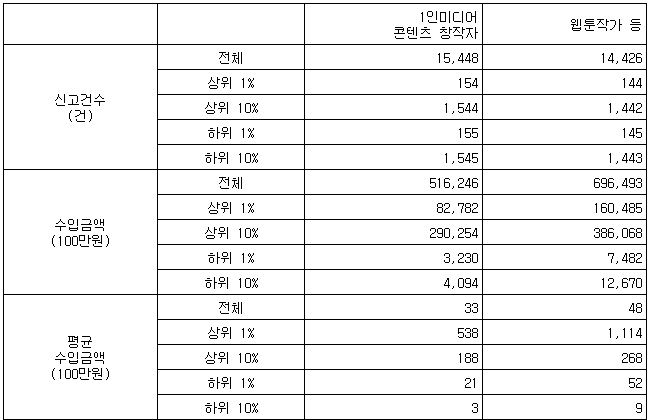 상위 1% 기준으로는, 웹툰 작가가 평균 11억1천400만원의 소득을 신고했다. 1인 미디어 창작자 소득(5억3천800만원)의 갑절을 웃도는 금액이다.