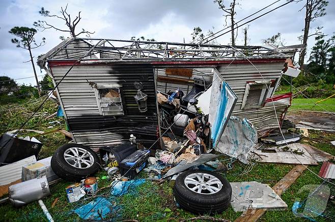 (포트 세인트 루시에 AFP=뉴스1) 우동명 기자 = 11일 (현지시간) 허리케인 밀턴이 휩쓸고 간 플로리다주 포트 세인트 루시에에서 부서진 모터 홈의 모습이 보인다. 2024.10.13