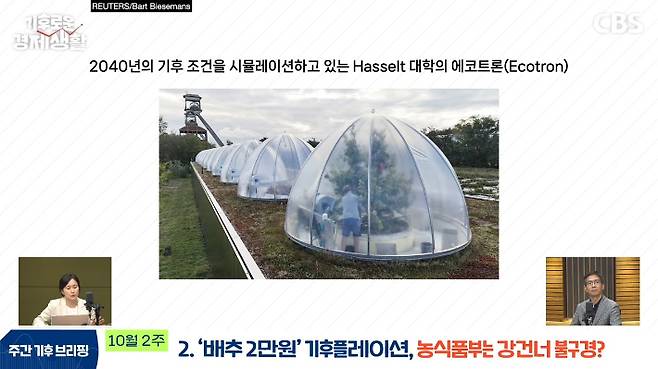 ◇ 최서윤> 벨기에 핫셀대학교에 에코트론(ecotron)이라는 게 설치됐어요. 여기 보면 약간 첨단 온실처럼 생겼죠. 환경 조건을 제어해서 인공 생태계를 이 안에 조성을 한 거예요. 돔 모양의 에코트론 안에 예측되는 2040년의 기후 조건을 재현해서 이 안에서 서양배가 어떻게 자라는지 보는 거죠.