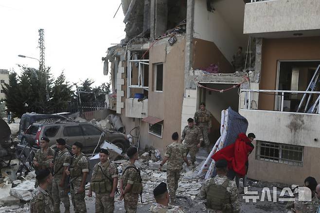 [베이루트=AP/뉴시스] 12일(현지시각) 레바논 베이루트 남부 바르자 마을 주민이 이스라엘 공습으로 파괴된 건물에서 매트리스를 꺼내 옮기고 있다. 2024.10.13.