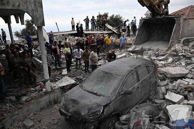 (비블로스 AFP=뉴스1) 우동명 기자 = 12일 (현지시간) 레바논 해안 도시 비블로스에서 헤즈볼라와 무력 충돌 중인 이스라엘 군의 공습을 받아 폐허가 된 건물과 불에 탄 차량이 보인다. 2024.10.13