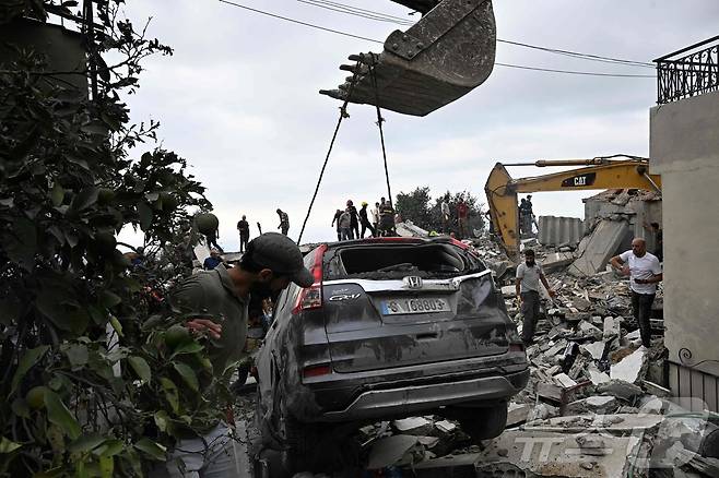 (비블로스 AFP=뉴스1) 우동명 기자 = 12일 (현지시간) 레바논 해안 도시 비블로스에서 헤즈볼라와 무력 충돌 중인 이스라엘 군의 공습을 받아 불에 탄 차량을 근로자들이 크레인으로 치우고 있다. 2024.10.13