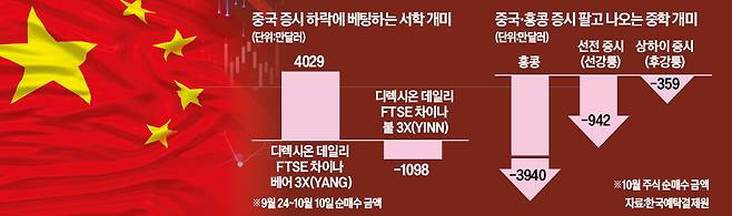 서학개미들이 중국 증시 하락에 베팅하고 있다. 중국 증시는 정부의 대규모 경기부양책 발표 후 폭등했다가 추가 부양책이 나온 뒤에는 폭락하는 등 롤러코스터를 타고 있다.