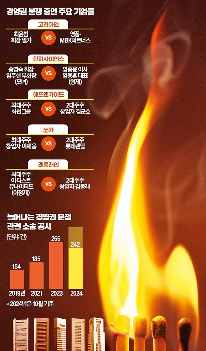 경영권 분쟁 사례는 올해 들어 사상 최대 규모로 늘었다. 오랜 동업자 관계에서 갈라선 고려아연 외에 한미사이언스와 같은 가족 간 분쟁, 에프앤가이드·래몽래인 등 최대주주와 기존 경영진의 다툼, KT&G 등 행동주의 펀드의 공세까지 사례는 다양하다. 전문가들은 기업의 경영권 승계가 활발해지고 사모펀드(PEF)나 다른 기업에서 투자를 유치하는 사례가 늘면서 최대주주 등의 지분율이 낮아진 점을 배경으로 꼽고 있다. 여기에 국내외 행동주의 펀드의 부상도 영향을 미쳤다. 이 과정에서 기업 실적이 예상을 밑돌거나 주주와 경영자 간 경영 방식에 이견이 생기자 경영권 다툼으로 번지는 양상이다.