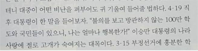 "4·19 직후 대통령이 한 말을 들어보자. '불의를 보고 방관하지 않는 100만 학도와 국민들이 있으니, 나는 얼마나 행복한가!' 이승만 대통령의 나라 사랑에 절로 고개가 숙여지는 대목이다."