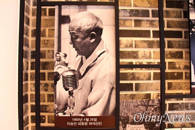 | ▲ 3.15의거 발원지 기념관 1층에 '이승만 하야'라는 설명이 붙은 사진이다. 이 사진은 1948년 8월 15일 정부수립 때 연설 장면이다. |
